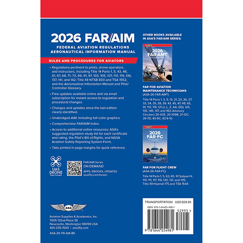 ASA has built a reputation for providing the aviation community with the most accurate and reliable FAR/AIM products available. The 2026 FAR/AIM book contains complete and up-to-date information from Titles 14 and 49 of the Code of Federal Regulations (14 and 49 CFR) pertinent to General Aviation, Sport Pilots, Flight Instructors, and Unmanned Aircraft System (UAS) operators, combined with the Aeronautical Information Manual (AIM), and a FREE email subscription service for you to receive updated information as it is released by the FAA.