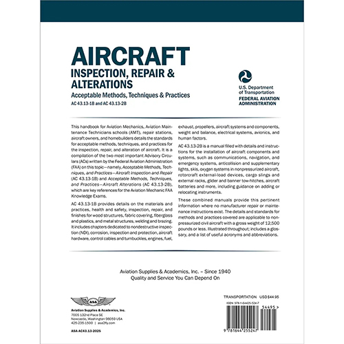 This handbook for Aviation Mechanics, Aviation Maintenance Technicians schools (AMT), repair stations, aircraft owners, and homebuilders details the standards for acceptable methods, techniques, and practices for the inspection, repair, and alteration of aircraft. It is a compilation of the two most important Advisory Circulars (ACs) written by the Federal Aviation Administration (FAA) on this topic—namely, Acceptable Methods, Techniques, and Practices—Aircraft Inspection and Repair (AC 43.13-1B) and Acceptable Methods, Techniques, and Practices—Aircraft Alterations (AC 43.13-2B), which are key references for the Aviation Mechanic FAA Knowledge Exams. AC 43.13-1B provides details on the materials and practices, health and safety, inspection, repair, and finishes for wood structures, fabric covering, fiberglass and plastics, and metal structures, welding and brazing. It includes chapters dedicated to nondestructive inspection (NDI), corrosion, inspection and protection, aircraft hardware, control cables and turnbuckles, engines, fuel, exhaust, propellers, aircraft systems and components, weight and balance, electrical systems, avionics, and human factors. AC 43.13-2B is a manual filled with details and instructions for the installation of aircraft components and systems, such as communications, navigation, and emergency systems, anti-collision and supplementary lights, skis, oxygen systems in non-pressurized aircraft, rotorcraft external-load devices, cargo slings and external racks, glider and banner tow-hitches, aircraft batteries and more, including guidance on adding or relocating instruments. These combined manuals provide this pertinent information where no manufacturer repair or maintenance instructions exist. The details and standards for methods and practices covered are applicable to non-pressurized civil aircraft with a gross weight of 12,500 pounds or less. Illustrated throughout; includes a glossary, and a list of useful acronyms and abbreviations.