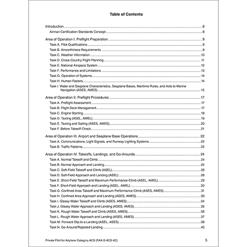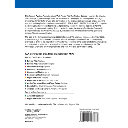 This Federal Aviation Administration (FAA) Private Pilot Airplane Airman Certification Standards softcover book (ACS-6C) supersedes the previous edition (ACS-6B.1), and is the guide for students, instructors, and evaluators to understand what applicants must know, do, and consider to pass their FAA Knowledge Exam and practical (checkride) and earn their private pilot certificate in the airplane category, single and multi-engine land and sea (ASEL, ASES, AMEL, AMES) classes. This ACS includes the aeronautical knowledge, risk management, and flight proficiency standards for certification, ACS codes, and the Companion Guide (FAA-G-ACS-2).