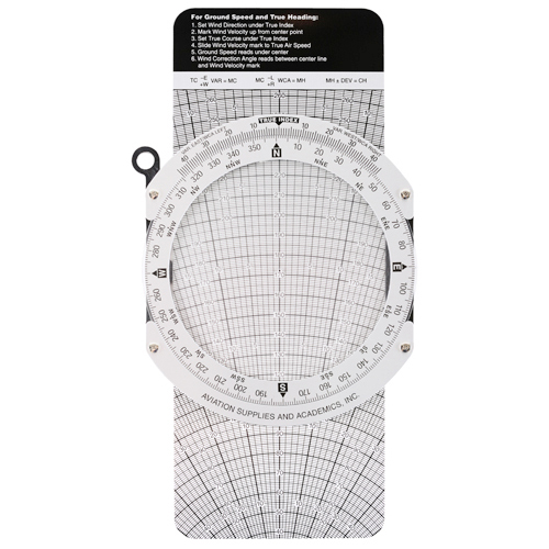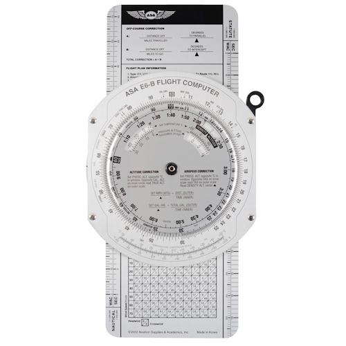 The best slide-rule-style flight computer on the market, with solid aluminum construction and easy-to-read lettering. ASA’s E6-B features a wind component grid and comprehensive crosswind correction chart, and on the other side the slide computes time, speed, distance, altitude, true airspeed, and density altitude problems as well as conversions. Nautical and statute scales are included. Vinyl case and instruction booklet included