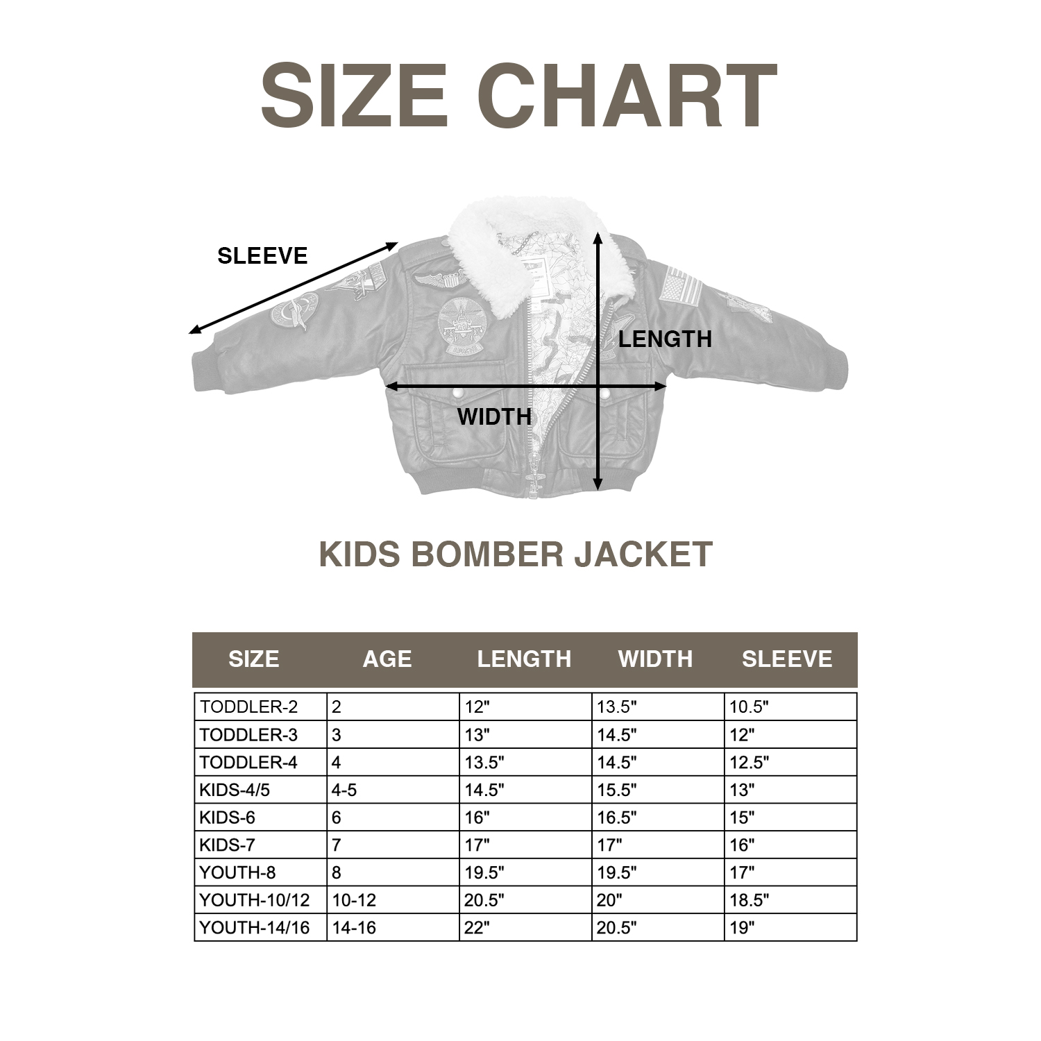 These kids' Bomber Jackets are a reproduction of a classic bomber, complete with simulated fleece collar. They are sturdily made with many special touches that make it unique, such as an airplane zipper pull, authentic aviation patches & colorful graphic map liner.