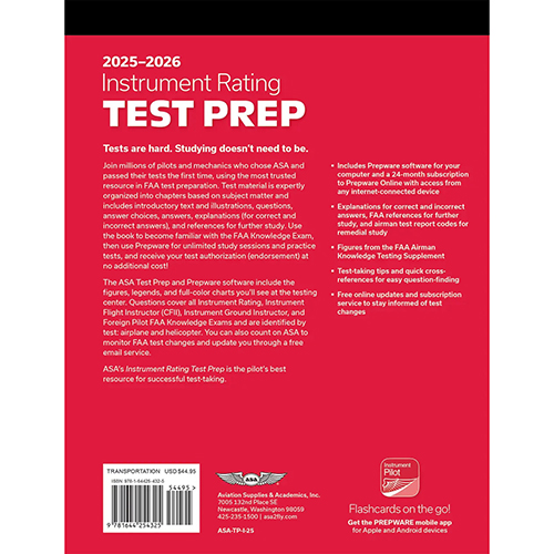 The ASA Test Prep and Prepware software include the figures, legends, and full-color charts you’ll see at the testing center. Questions cover all Instrument Rating, Instrument Flight Instructor (CFII), Instrument Ground Instructor, and Foreign Pilot FAA Knowledge Exams and are identified by test: airplane and helicopter. You can also count on ASA to monitor FAA test changes and update you through a free email service.