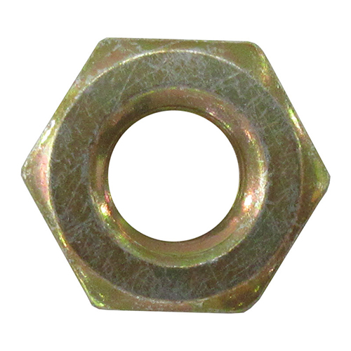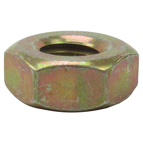 This hex machine nut (EDMO# 356492252) has a 1/4-20 thread size, 7/16 head size, and is made from cadmium plated carbon steel.