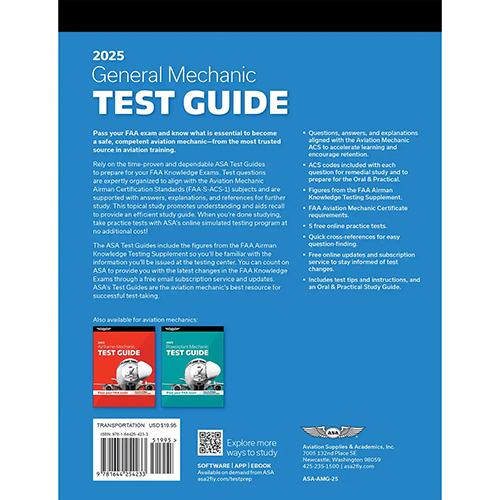 This ASA Aviation Mechanic General Test Guide softcover book includes the figures from the FAA Airman Knowledge Testing Supplement so you’ll be familiar with the information you’ll be issued at the testing center. You can count on ASA to provide you with the latest changes in the FAA Knowledge Exams through a free email subscription service and updates. ASA’s Test Guides are the aviation mechanic’s best resource for successful test-taking.