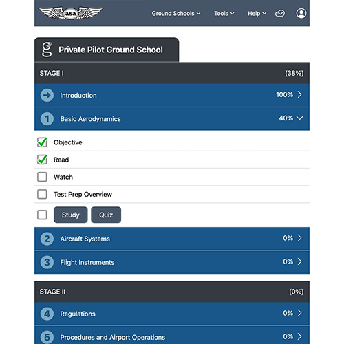 With ASA’s time-tested and trusted content you'll gain the aeronautical knowledge required to become a safe and competent pilot. This convenient on-demand solution is effective for self-study and the organization makes it an easy addition to any Part 61 or 141 instructor-led ground school. Approved for FAA Wings credits, the comprehensive curriculum consists of lessons featuring internet-based evaluation, resources, and course tracking, supported with professional multi-media presentations from the leaders in aviation training.