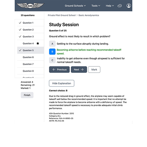 - Practice: Quizzes, sample FAA questions supported with answers, explanations, and review modes from ASA Prepware