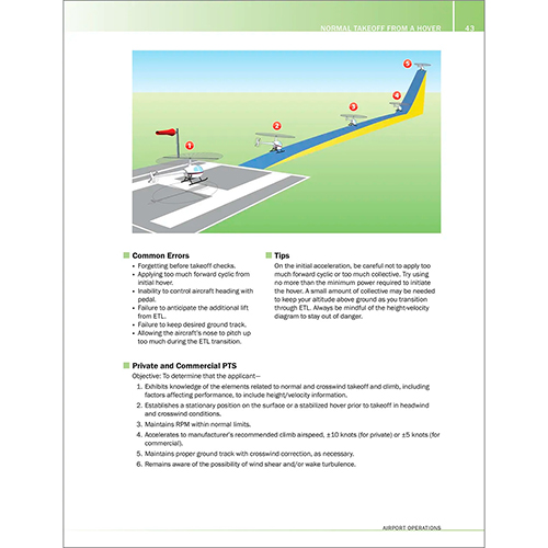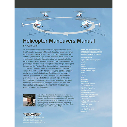 This maneuvers manual helps pilots visualize concepts learned in flight training and incorporate the Practical Test Standards into every maneuver. The full-color illustrations and textual explanations work in conjunction with an instructor’s lessons, and facilitate effective preflight and postflight briefings. The Helicopter Maneuvers Manual gives readers a crystal-clear picture of what level of performance is expected of them for each flight profile and includes insights into the common errors associated with each maneuver. Applicable to all helicopter models, the book also features tips for the popular Robinson R22. This book is an essential tool for any flight bag.