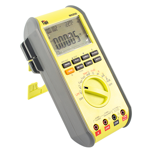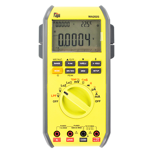 The TPI WA2025 handheld multimeter (EDMO# WA2025) includes a Wire Fault Test that finds short circuits in wire runs and displays the distance to the short. The low 50 Ω resistance range, supported by a stable 20 VDC 10 mA output, ensures stable measurements, while the Low Z voltage mode reduces ghost readings in complex electrical environments. The WA2025 features Bluetooth 5.0 connectivity for remote viewing and report creation, and a rugged IP51 rated housing.