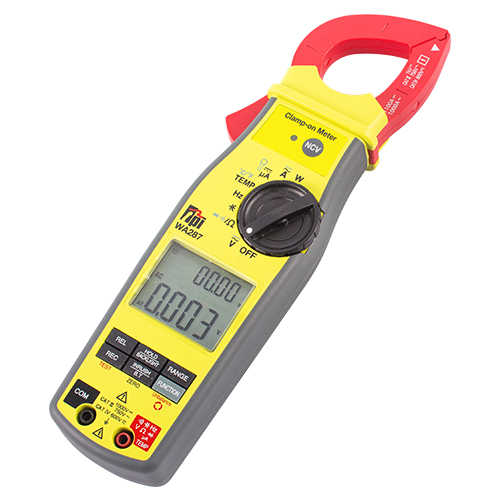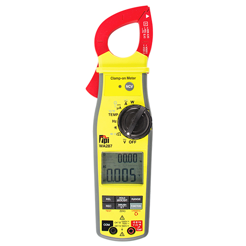 The slim design WA287 is a hand-held, auto ranging clamp-on digital multimeter (EDMO# WA287) with Bluetooth output for use with the TPI View app. Backlit dual display, True RMS response, Frequency with Duty Cycle, Min/Max/Avg, Temperature, Inrush Current measurement, Capacitance, DC microamps, and Non-Contact Voltage detection are just a few of the features of the 287.